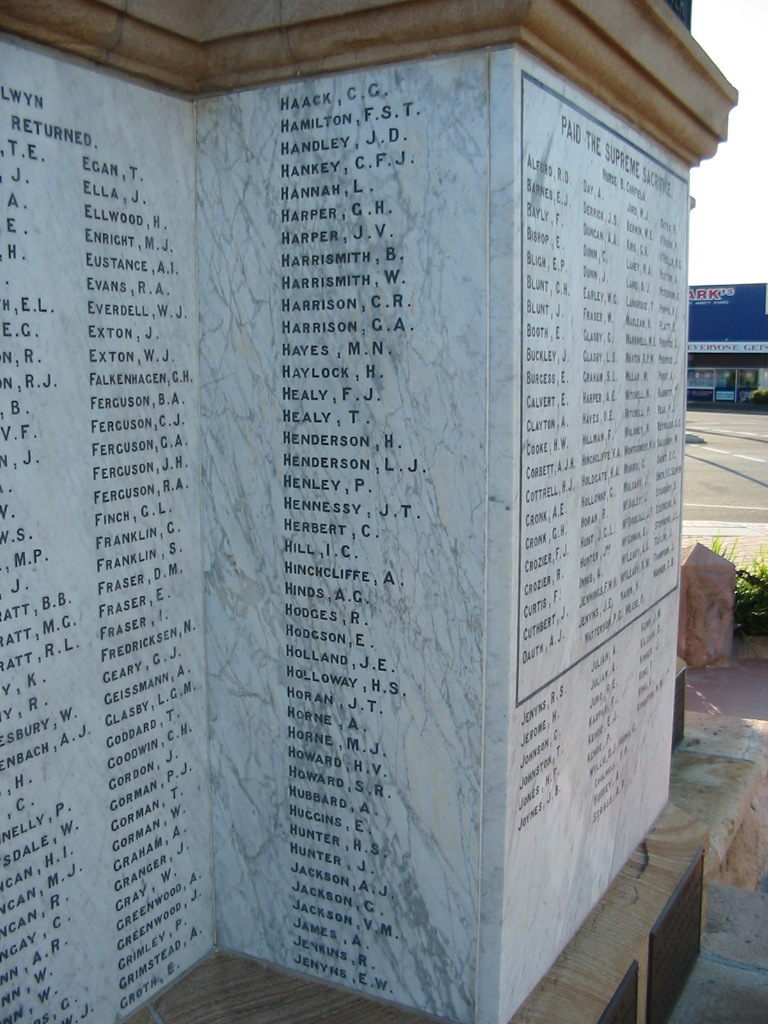 Egan T Ella J Ellwood H Enright M J Eustance A I Evans R A Everdell W J Exton J Exton W J Falkenhagen G H Ferguson B A Ferguson C J Ferguson G A Ferguson J H Ferguson R A Finch G L Franklin G Franklin S Fraser D M Fraser E Fraser I Fredricksen N Geary G J Geissmann A Glasby L G M Goddard T Goodwin C H Gordon J Gorman P J Gorman T Gorman W Graham A Granger J Gray W Greenwood A Greenwood J Grimley P Grimstead A Groth E Haack C G Hamilton F S T Handley J D Hankey C F J Hannah L Harper G H Harper J V Harrismith B Harrismith W Harrison C R Harrison G A Hayes M N Haylock H Healy F J Healy T Henderson H Henderson L J Henley P Hennessy J T Herbert C Hill I C Hinchliffe A Hinds A G Hodges R Hodgson E Holland J E Holloway H S Horan J T Horne A Horne M J Howard H V Howard S R Hubbard A Huggins E Hunter H S Hunter J Jackson A J Jackson G Jackson V M James A Jenkins R Jenyns E W