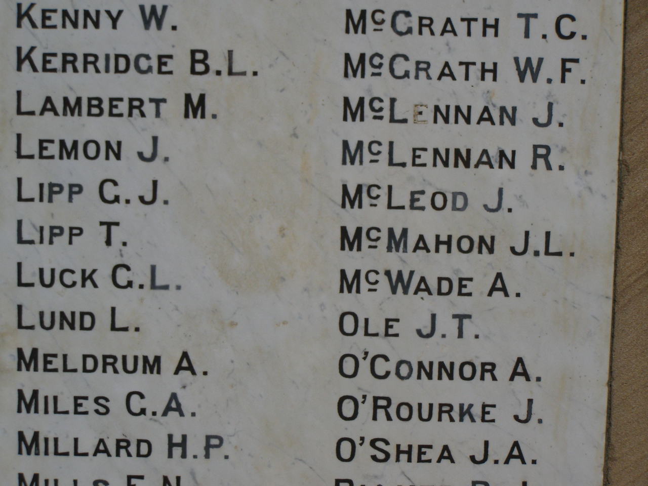 W. KENNY B.L. KERRIDGE M. LAMBERT J. LEMON G.J. LIPP T. LIPP G.L. LUCK L. LUND A. MELDRUM G.A. MILES H.P. MILLARD T.C. McGRATH W.F. McGRATH J. McLENNAN R. McLENNAN J. McLEOD J.L. McMAHON A. McWADE J.T. OLE A. O'CONNOR J. O'ROURKE J.A. O'SHEA Greenmount War Memorial