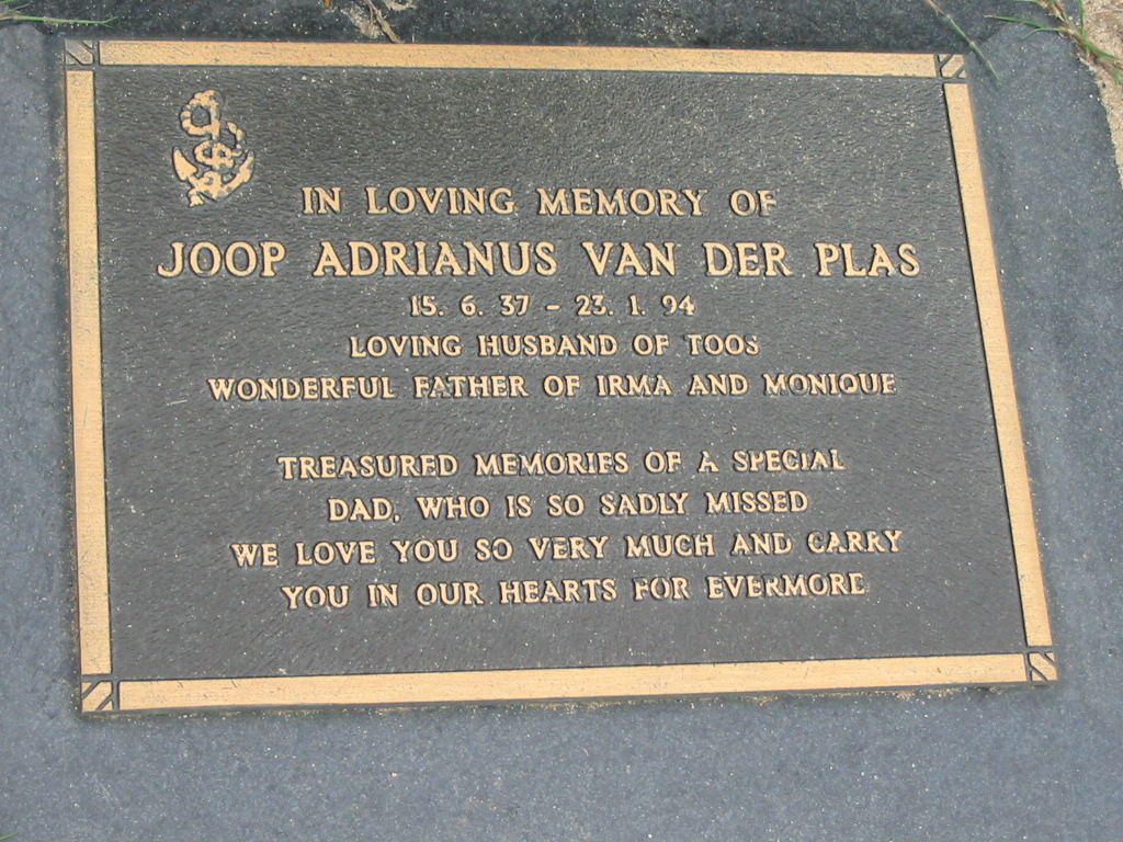 Joop Andrianus VAN DER PLAS, 15-6-37 - 23-1-94, husband of Toos, father of Irma and Monique;