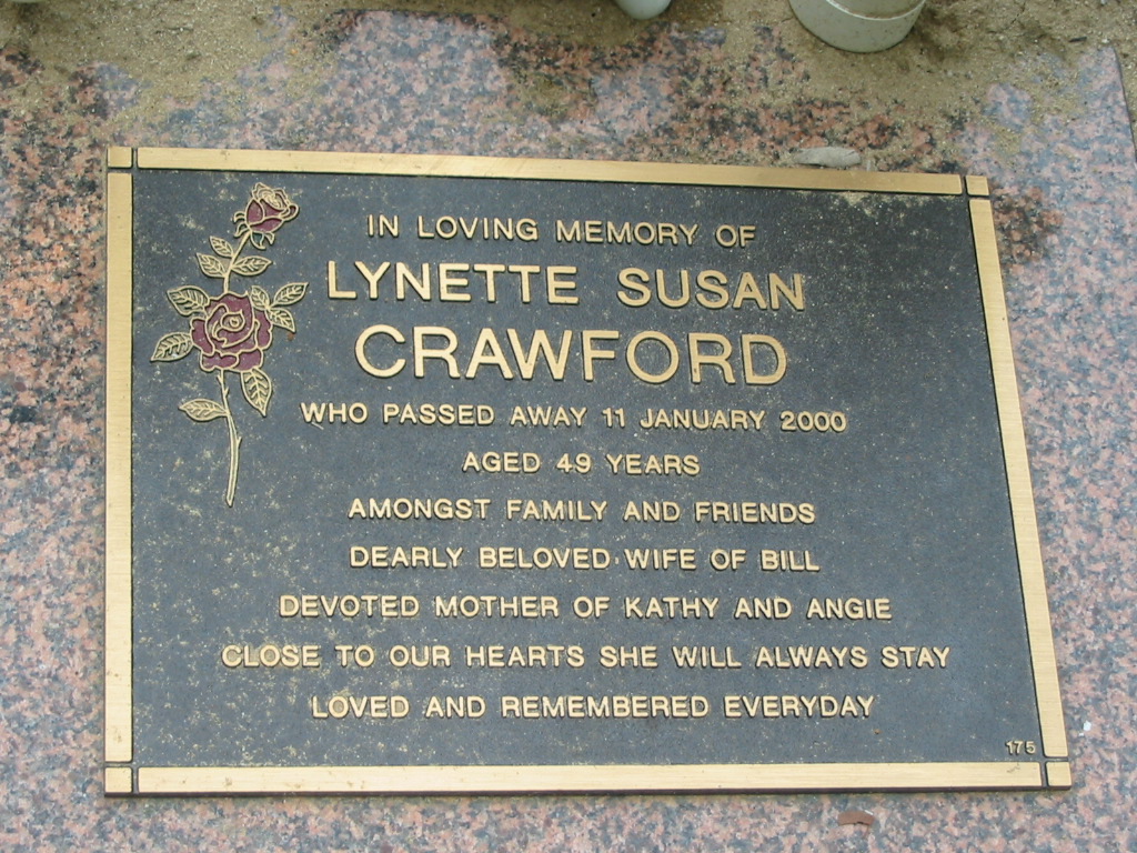 Lynette Susan CRAWFORD died 11 Jan 2000 aged 49 years, wife of Bill, mother of Kathy and Angie;