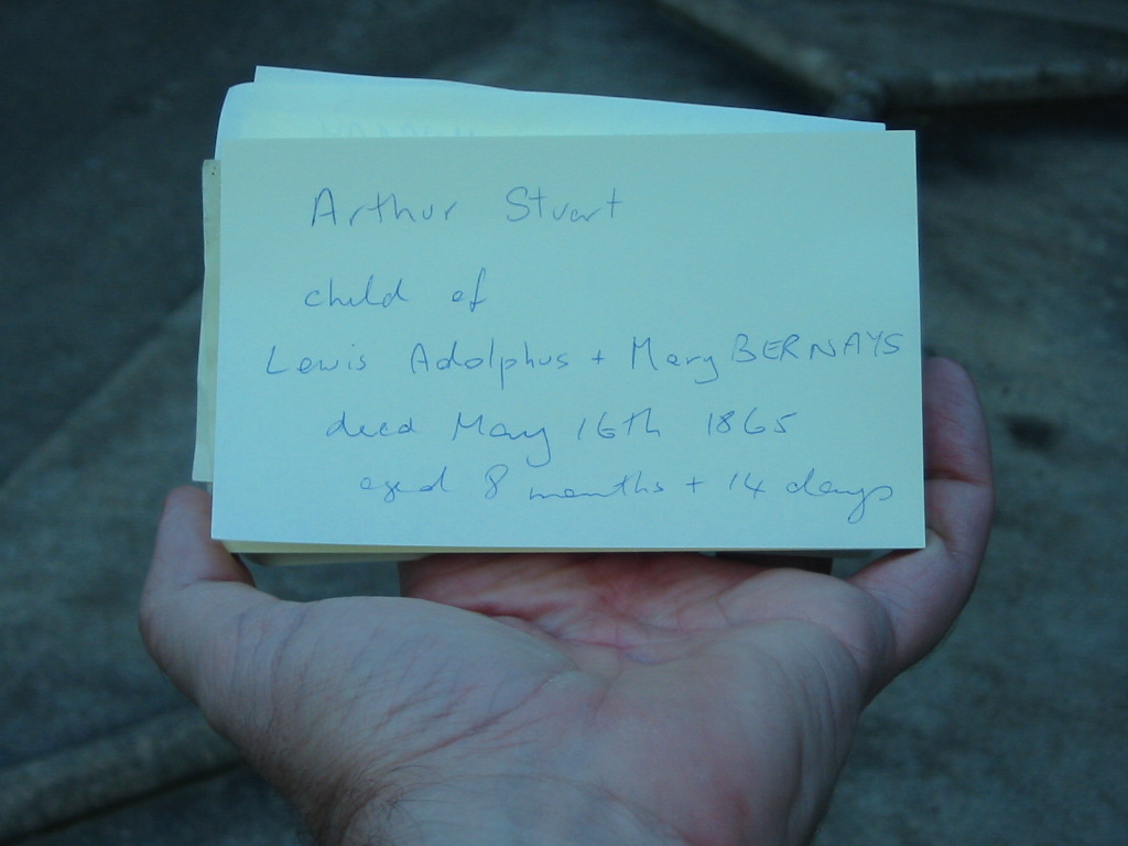 Arthur Stuart child of Lewis Adolphus & Mary BERNAYS died 16 May 1865 aged 8 months & 14 days,