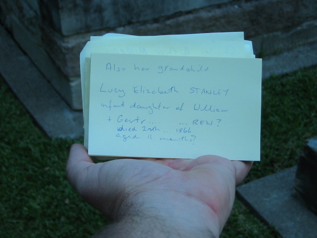 grandchild Lucy Elizabeth Stanley infant daughter of William & Gertr???? DREW died 28 ?? 1866 aged 11 months?,