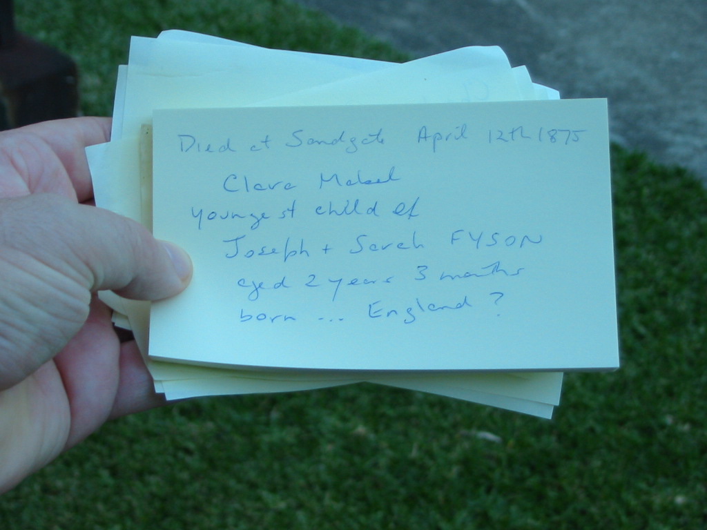 died Sandgate 12 Apr 1875 Clara Mabel youngest child of Joseph & Sarah FYSON aged 2 years 3 months born England?,