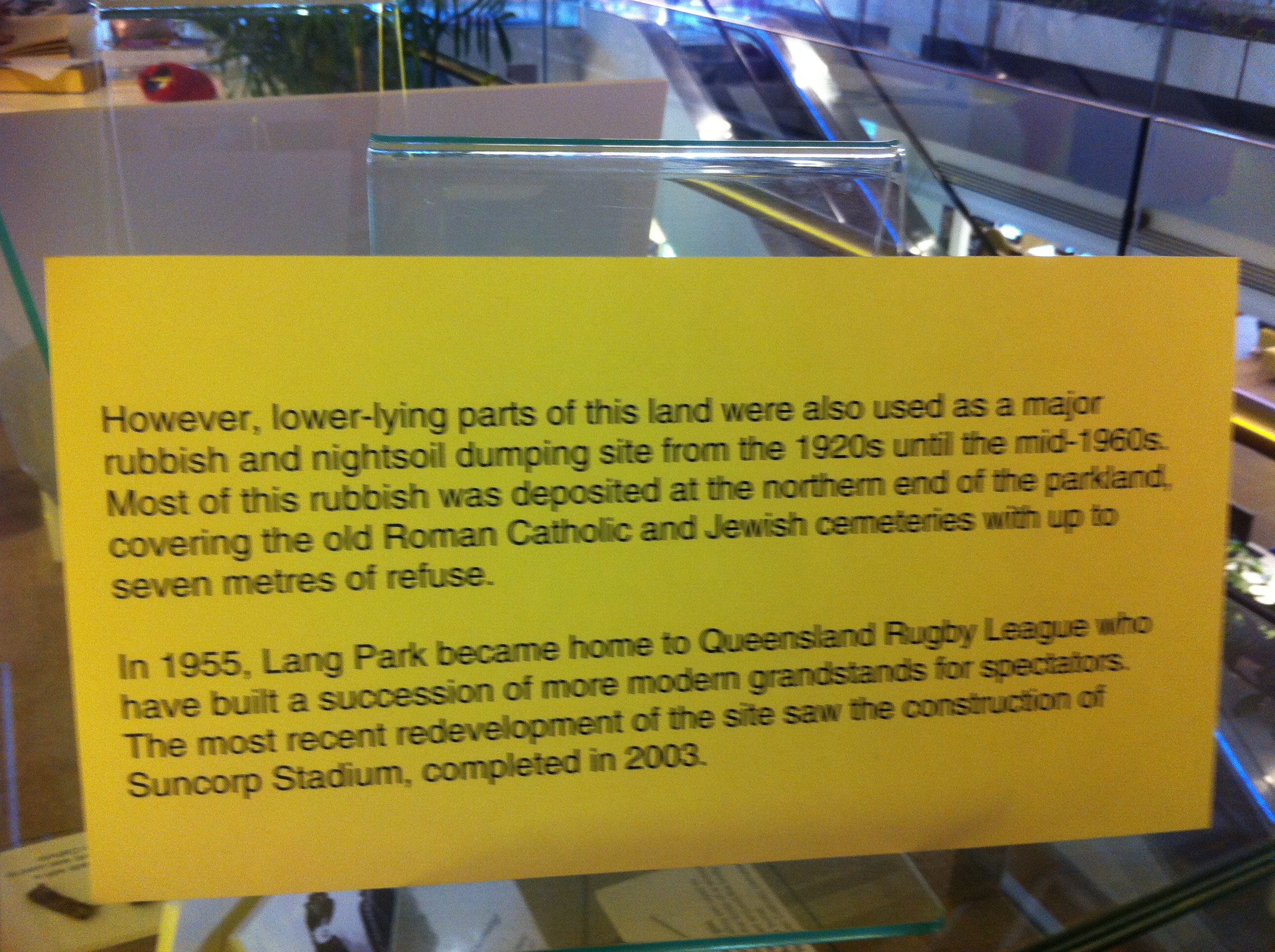 The cemetery lay neglected and overgrown from 1875 until 1913, when the land was reclaimed by the government to provide a park and sporting field for the nearby residents of Milton and Paddington. This was named Lang Park.