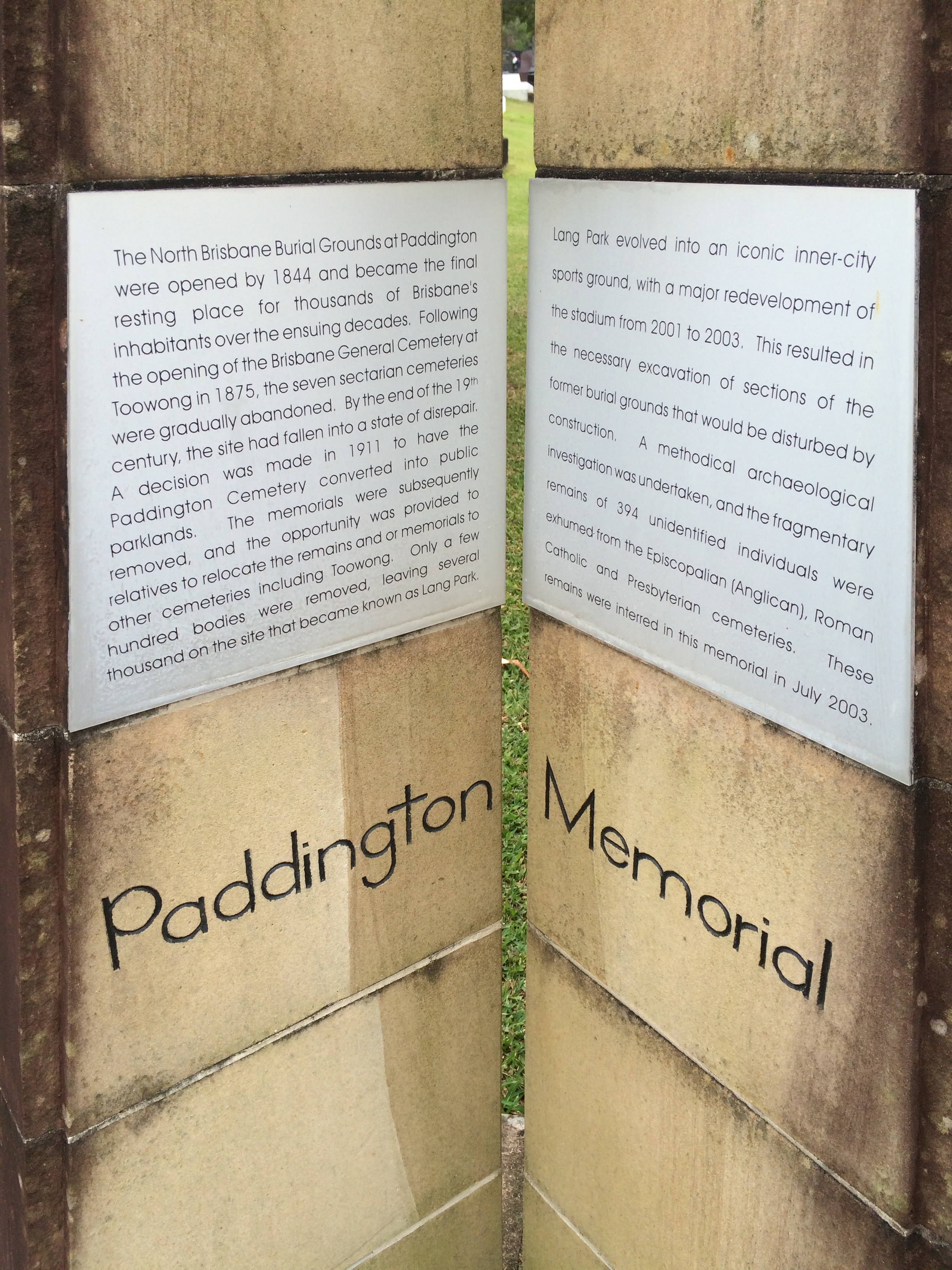 In 1914, some unclaimed headstones were placed in the Memorial Reserve situated between Lang Park and Christ Church. There is a plaque to that effect in the memorial reserve.