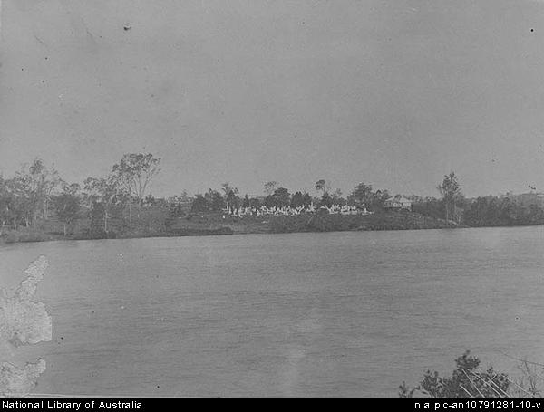 S. Brisbane Cemetery from the river [picture]. 1890. 1 of 1 album (27 photographs) ; 19.1 x 27.3 cm. Part of Album of photographs of Harlaxton, Toowoomba, and Brisbane [picture].