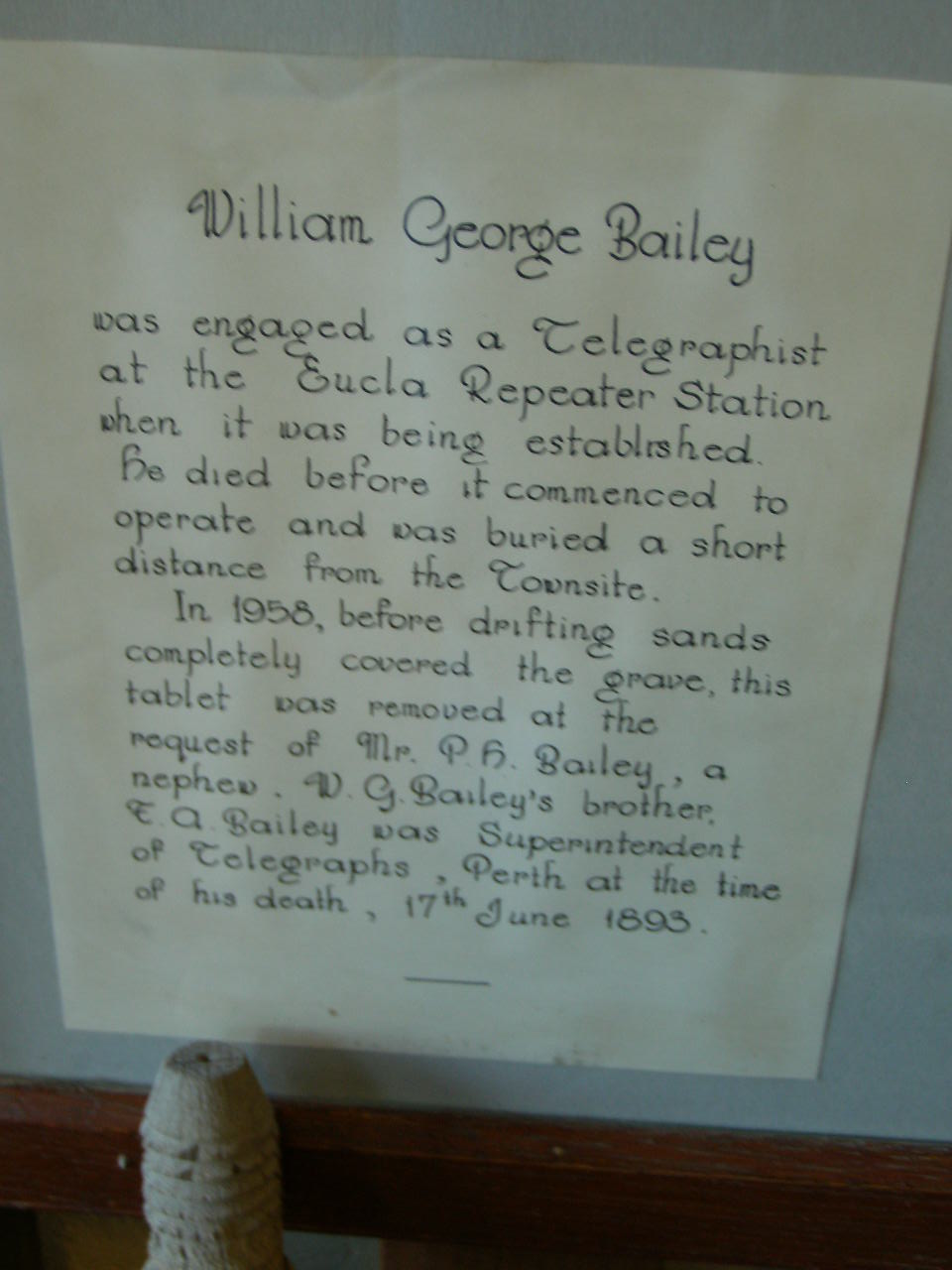 removed from Eucla cemetery, now in Eucla museum,