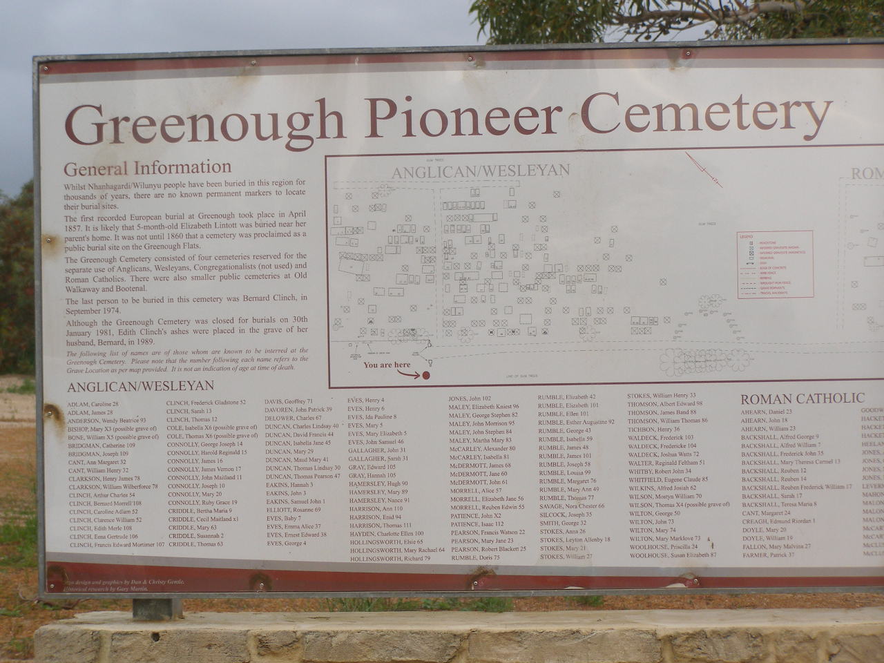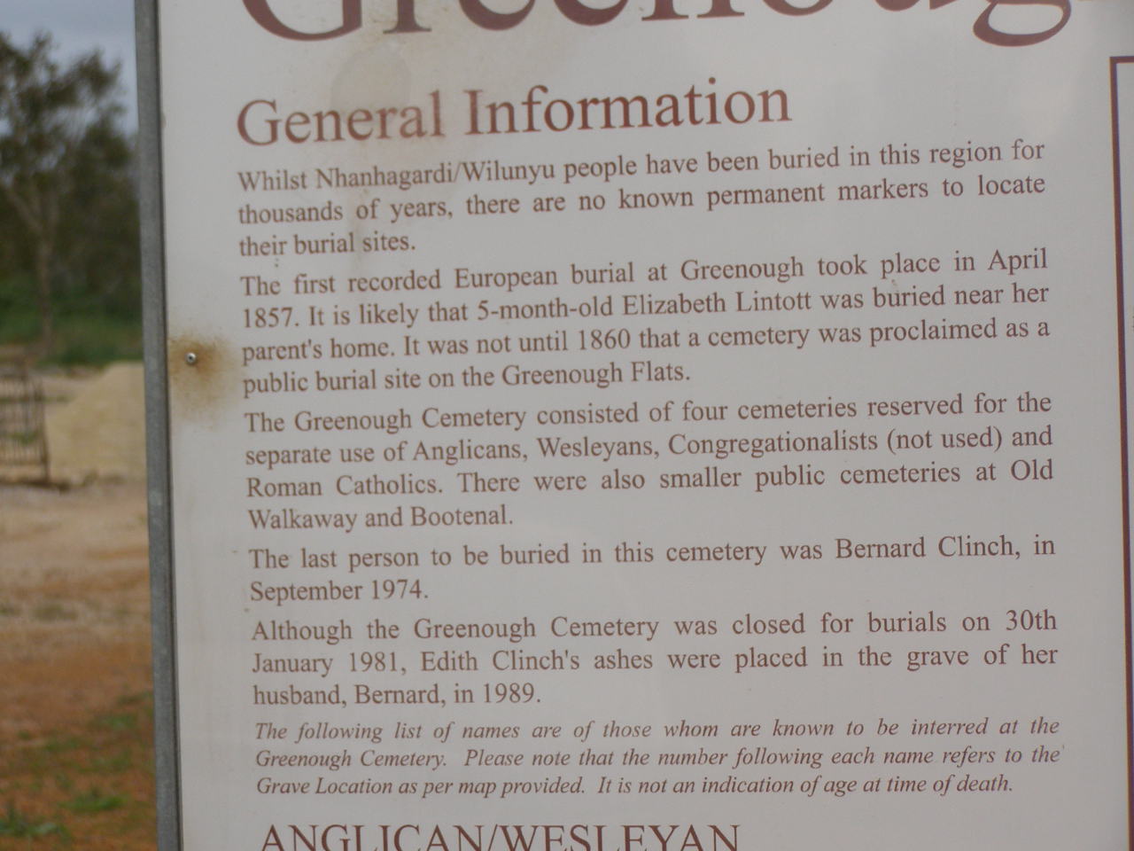 The first recorded European burial at Greenough took place in April 1857. It is likely that 5-month old Elizabeth Lintott was buried near her parent's home. It was not until 1860 that a cemetery was proclaimed as a public burial site on the Greenough Flats.