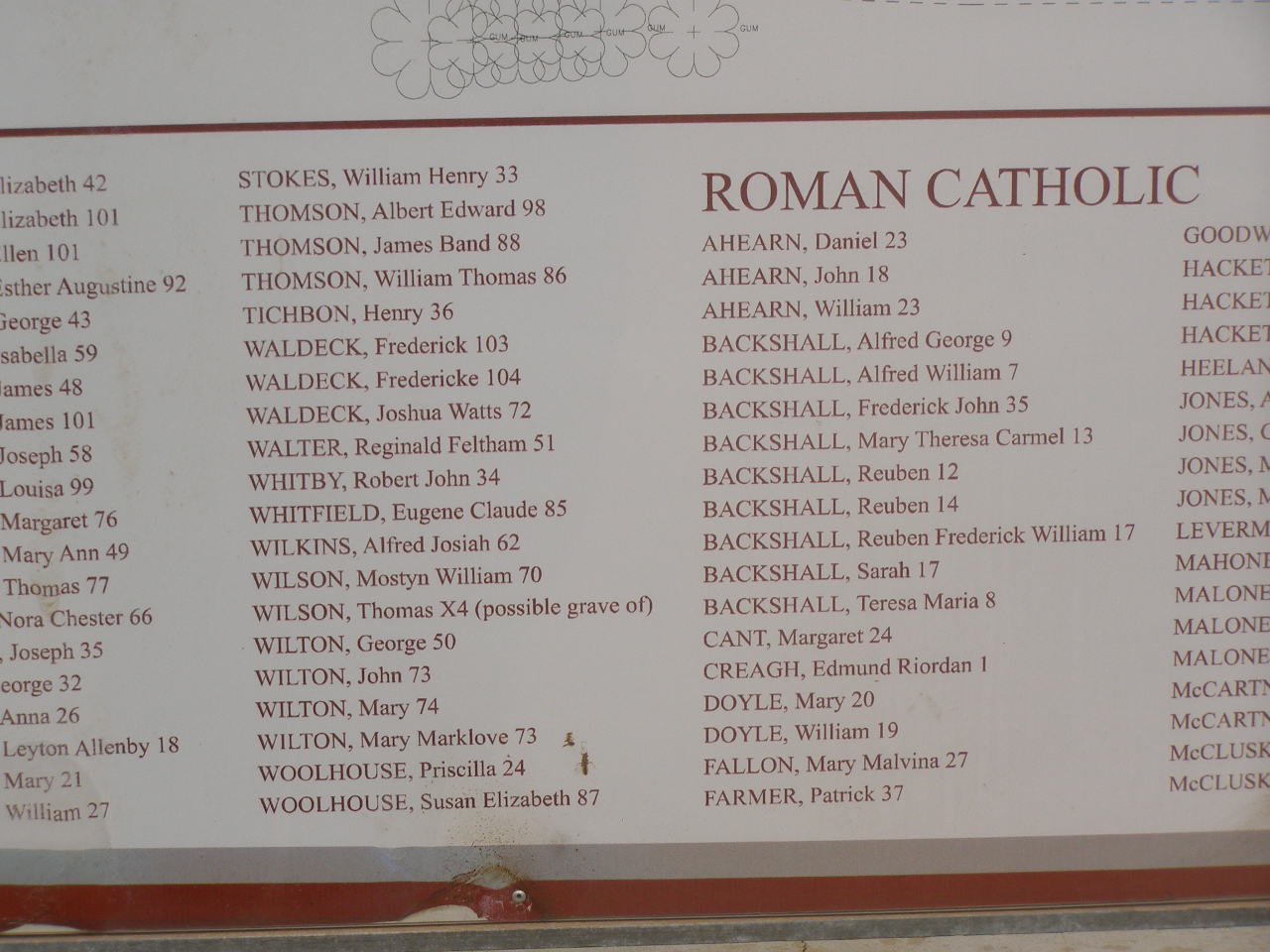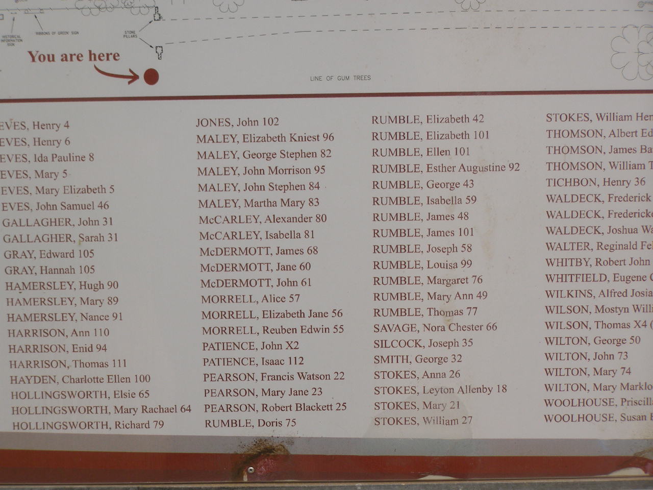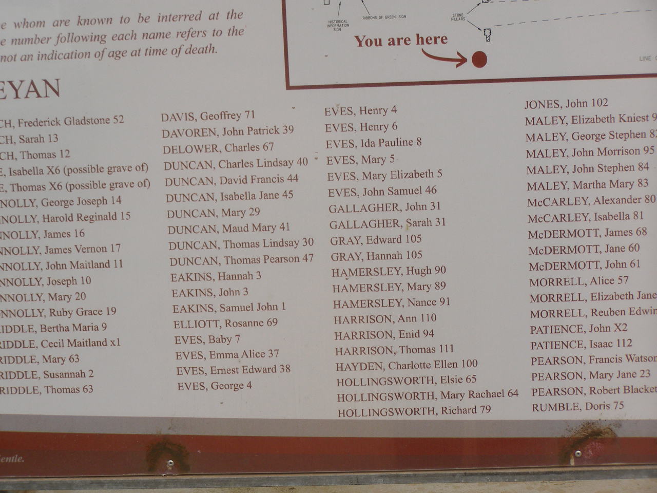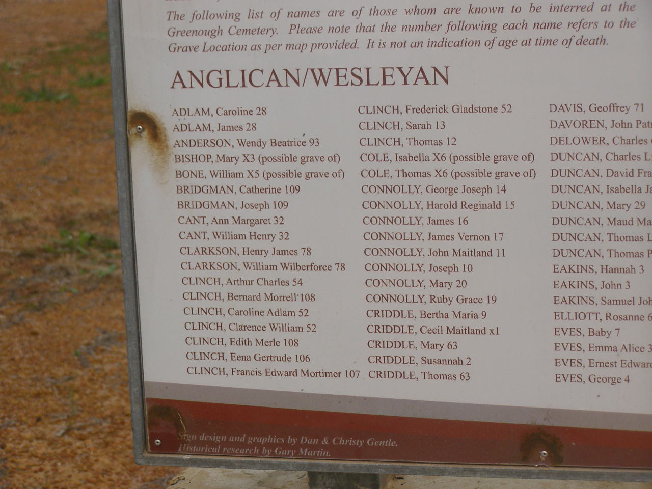 The following list of names are of those whom are known to be interred at the Greenough Cemetery. Please note that the number following each name refers to the Grave Location as per map provided. It is not an indication of age at time of death.