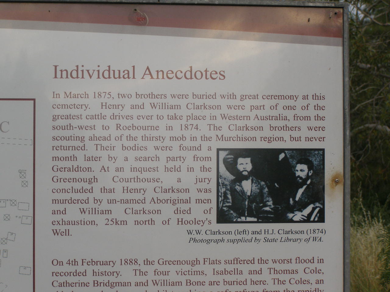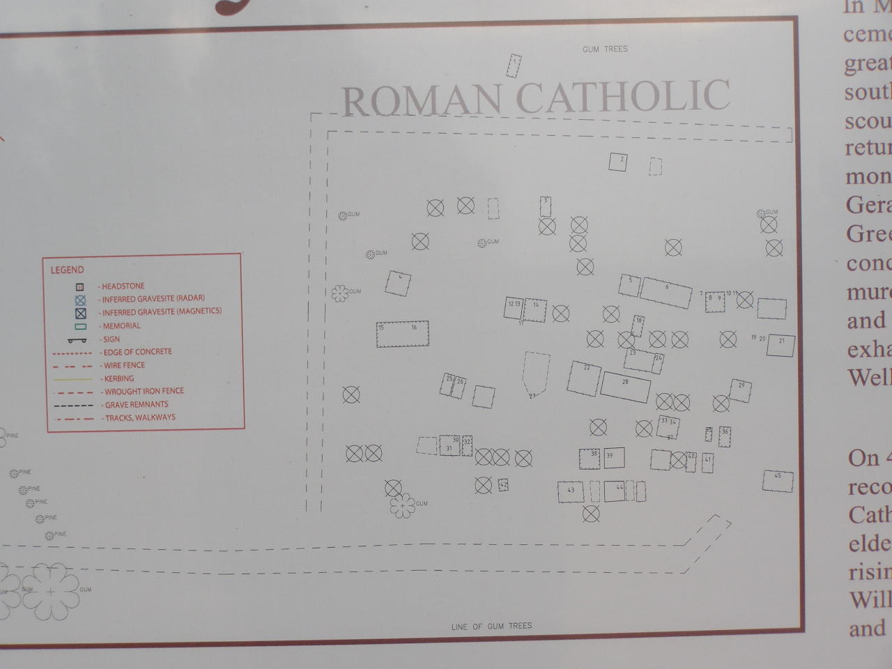 The Greenough Cemetery cpnsisted of four cemeteries reserved for the separate use of Anglicans, Wesylans, Congregationalists (not used) and Roman Catholics. There were also smaller public cemeteries at Old Walkaway and Bootenal.