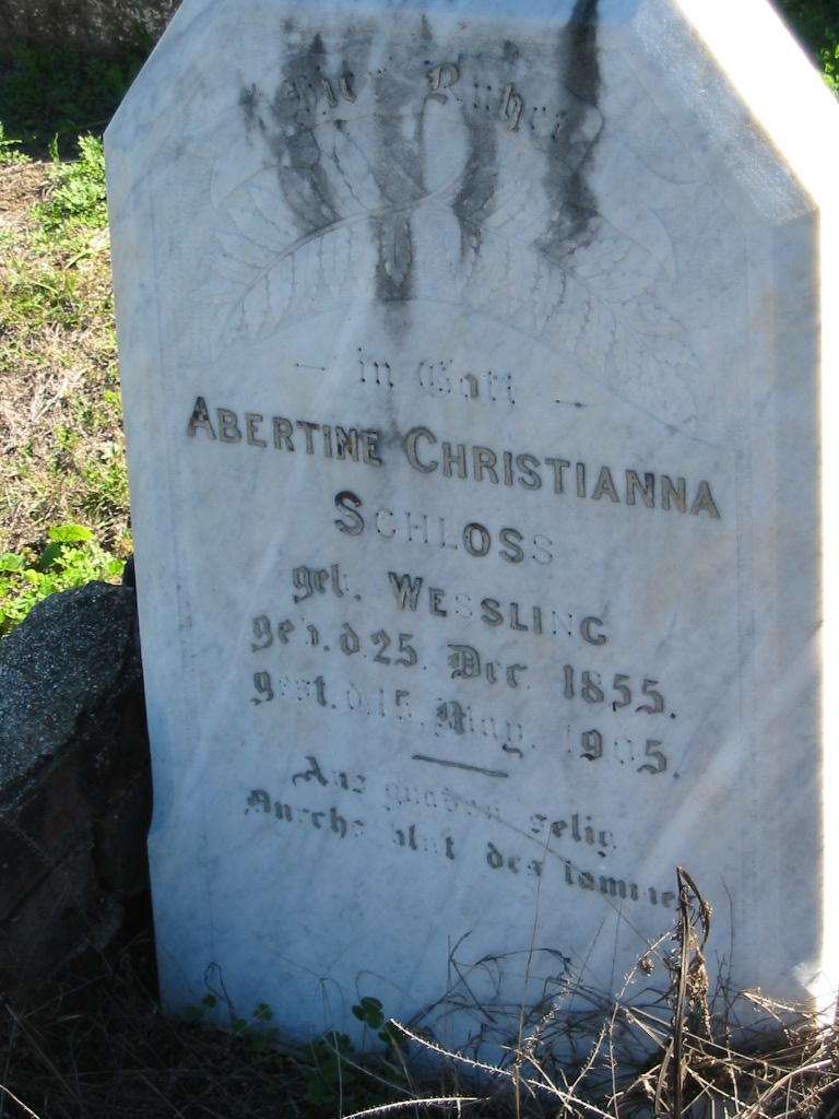 Abertine Christianna SCHLOSSS, nee WESSLING, born 25 Dec 1855 died 15 May 1905;