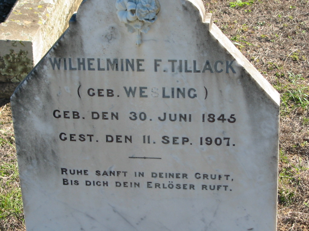 Wilhelmine F. TILLACK, nee WESLING, born 30 June 1845 died 11 Sept 1907;