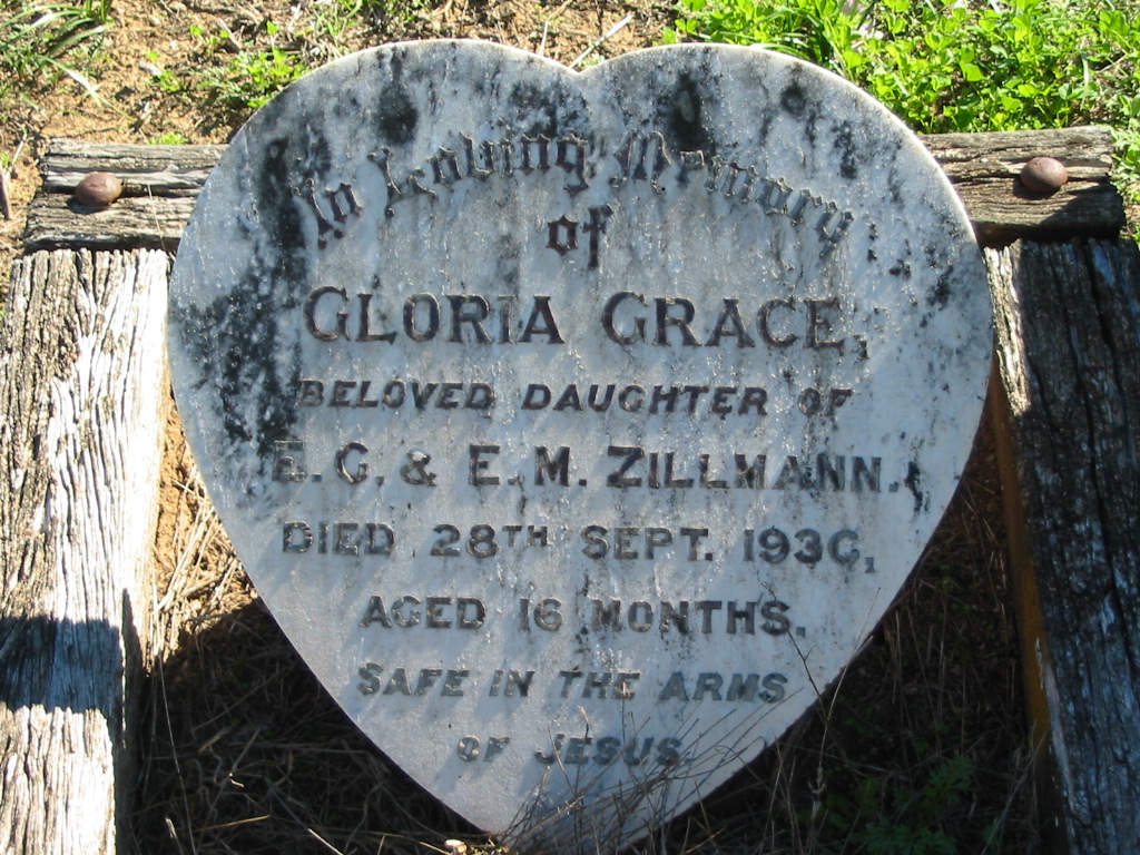 Gloria Grace, daughter of E.G. & E.M. ZILLMANN, died 28 Sept 1936 aged 16 months;