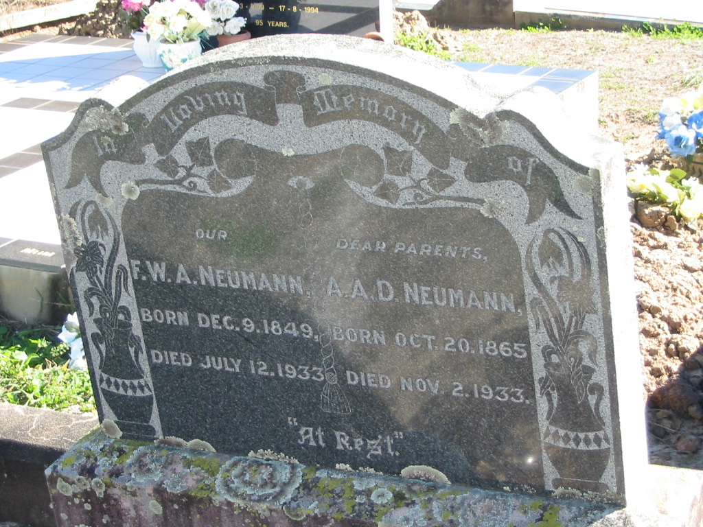 A.A.D. NEUMANN, born 20 Oct 1865 died 2 Nov 1933;