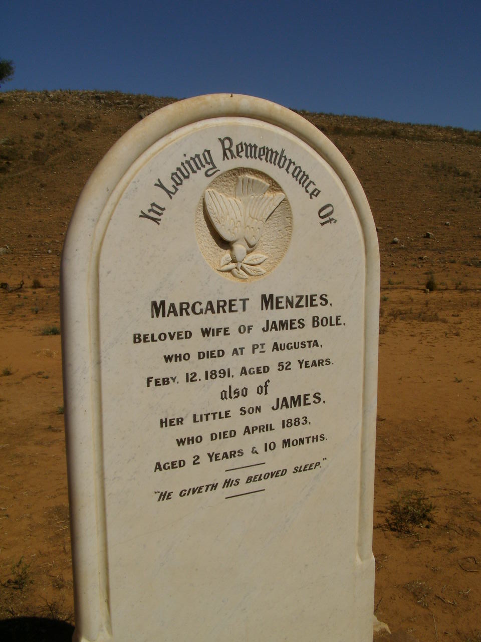 Margaret MENZIES, (wife of James BOLE) died at Pt Augusta Feb 12 1891, aged 52