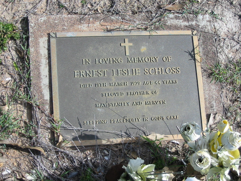 Ernest Leslie Schloss, died 19 Mar 1979 aged 48 years, beloved brother of May, Stanley and Mervyn.
