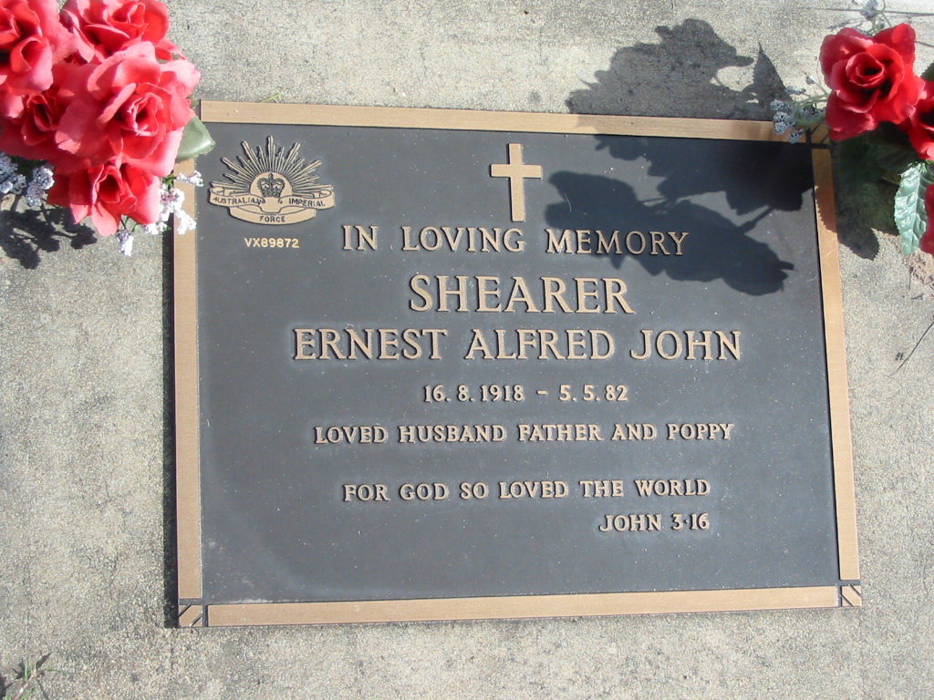 Ermest Alfred John SHEARER, 16-8-1918 - 5-5-82, husband father poppy;
