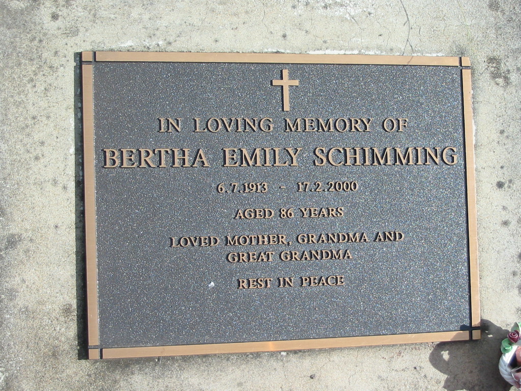 Bertha Emily SCHIMMING, 6-7-1913 - 17-2-2000 aged 86 years, mother grandma great-grandma;