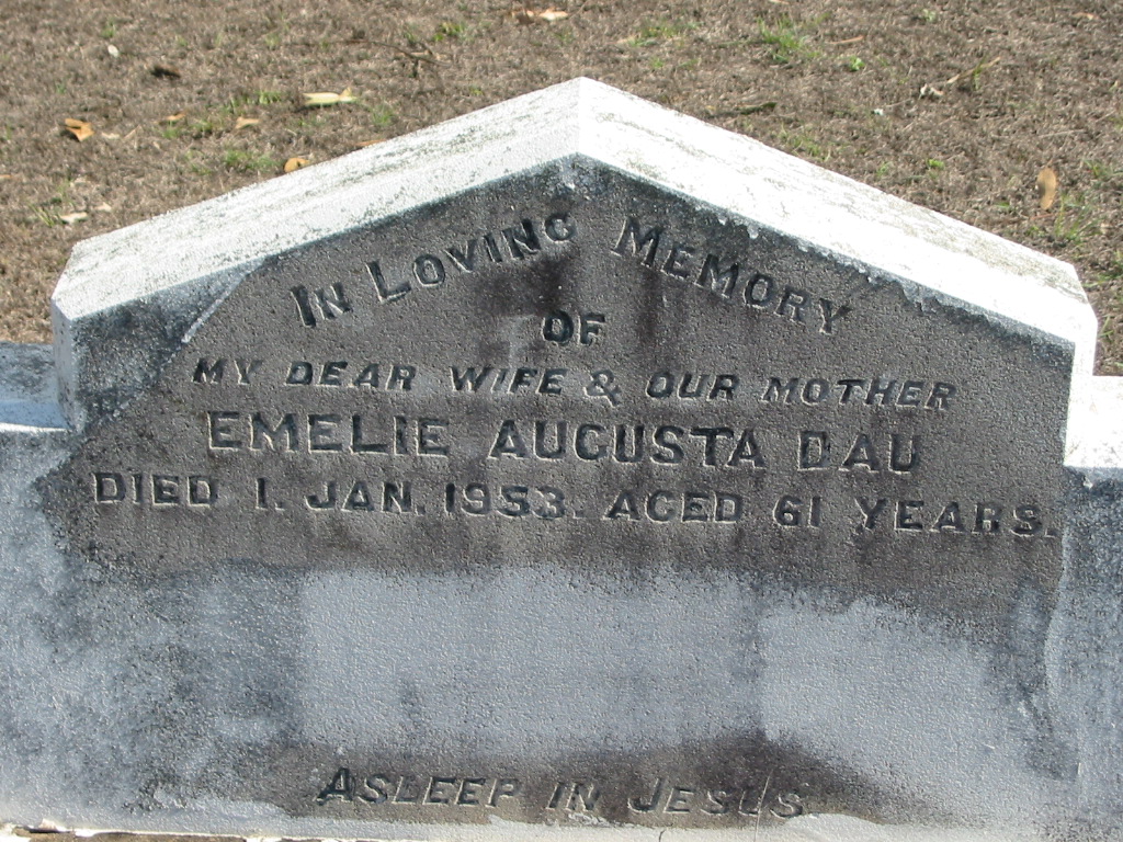 Emelie Augusta DAU, died 1 Jan 1953 aged 61 years, wife mother;