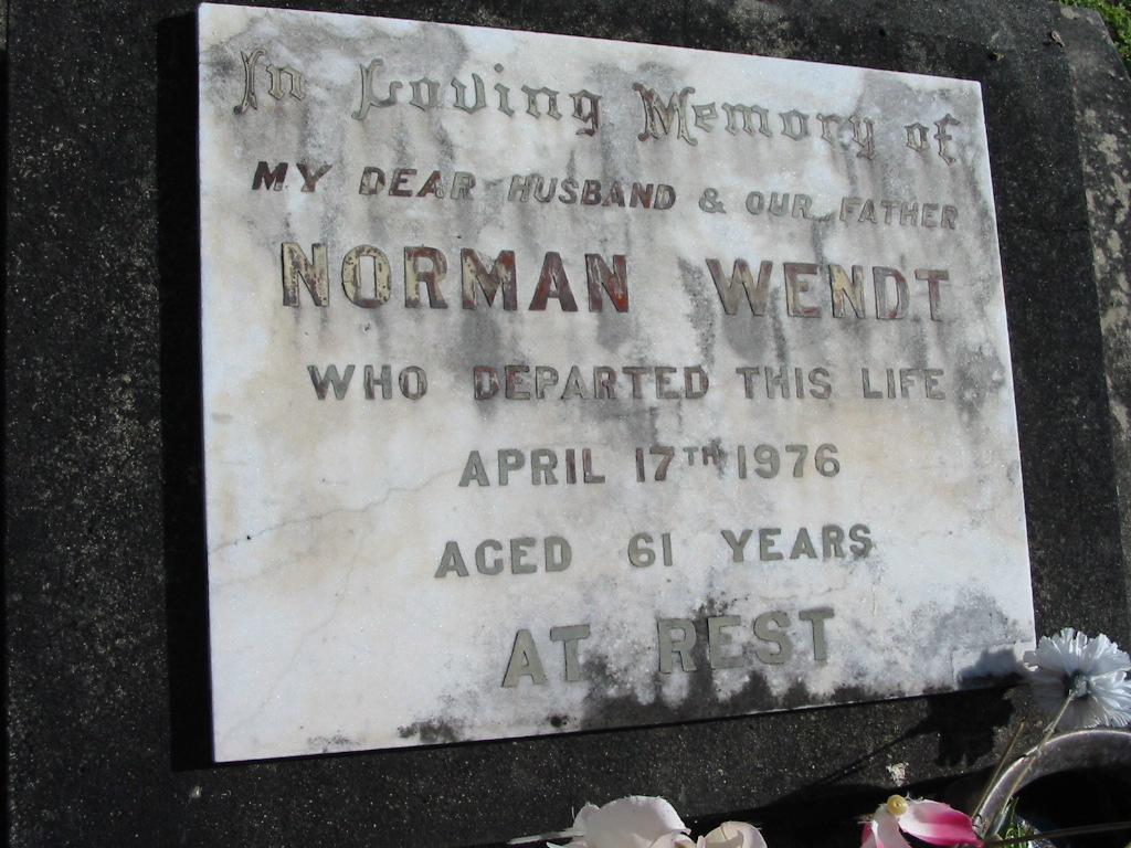 Norman WENDT, died 17 APril 1976 aged 61 years, husband father;