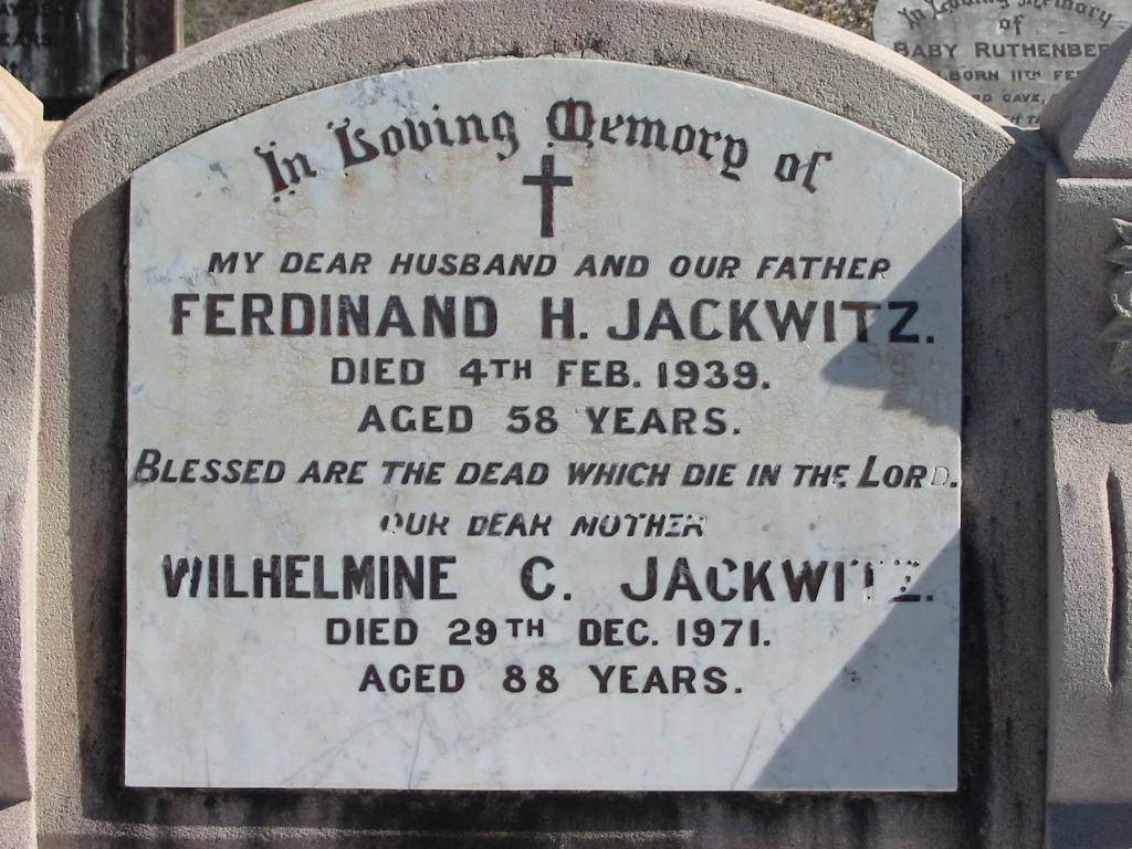 Ferdinand H. JACKWITZ, died 4 Feb 1939 aged 58 years, husband father;