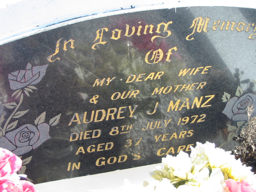 Audrey J. MANZ, died 8 July 1972 aged 37 years, wife mother;