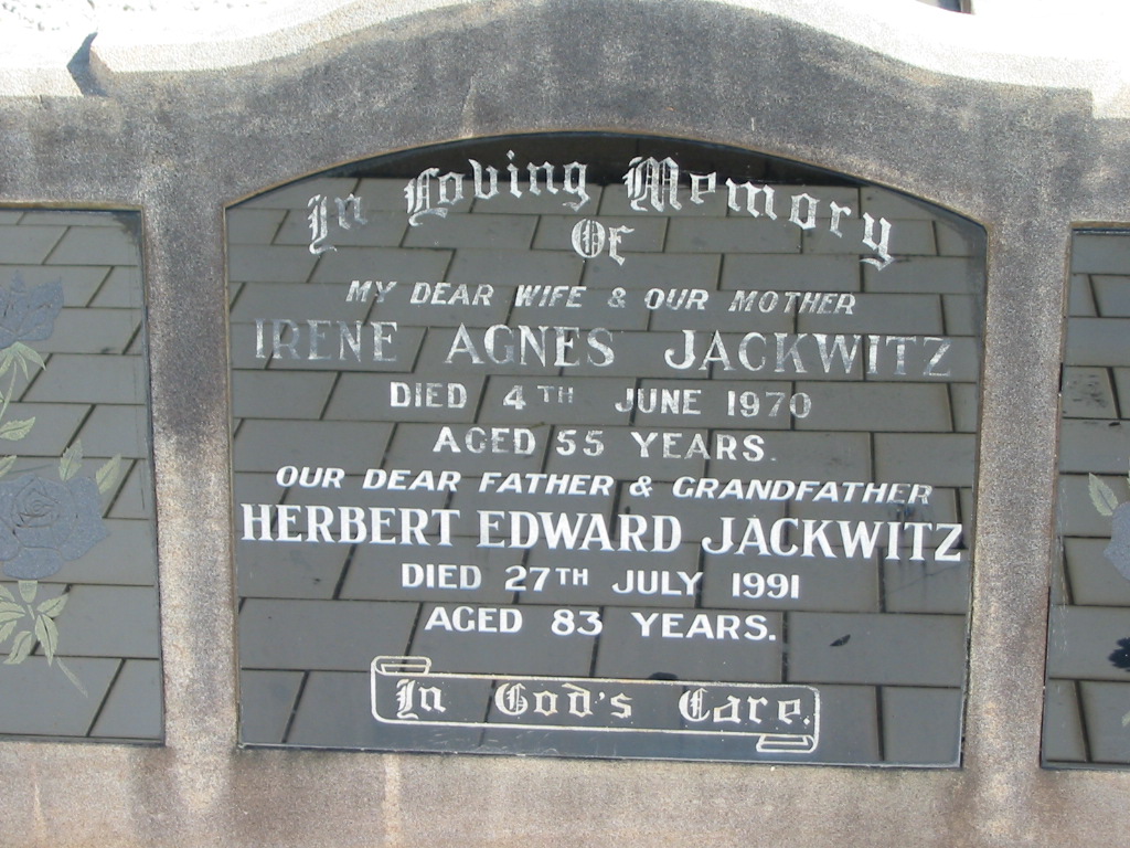 Irene Agnes JACKWITZ, died 4 June 1970 aged 55 years, wife mother;