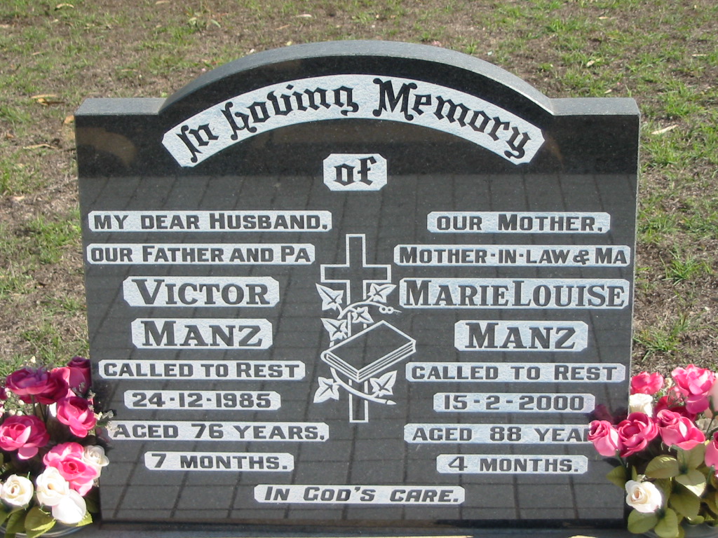 Marie Louise MANZ, died 15-2-2000 aged 88 years 4 months, mother mother-in-law ma;