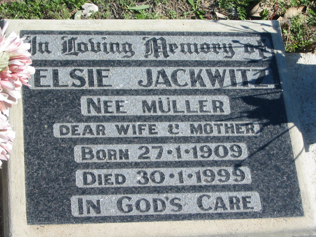 Elsie JACKWITZ, nee MULLER, born 27-1-1909 died 30-1-1999, wife mother;