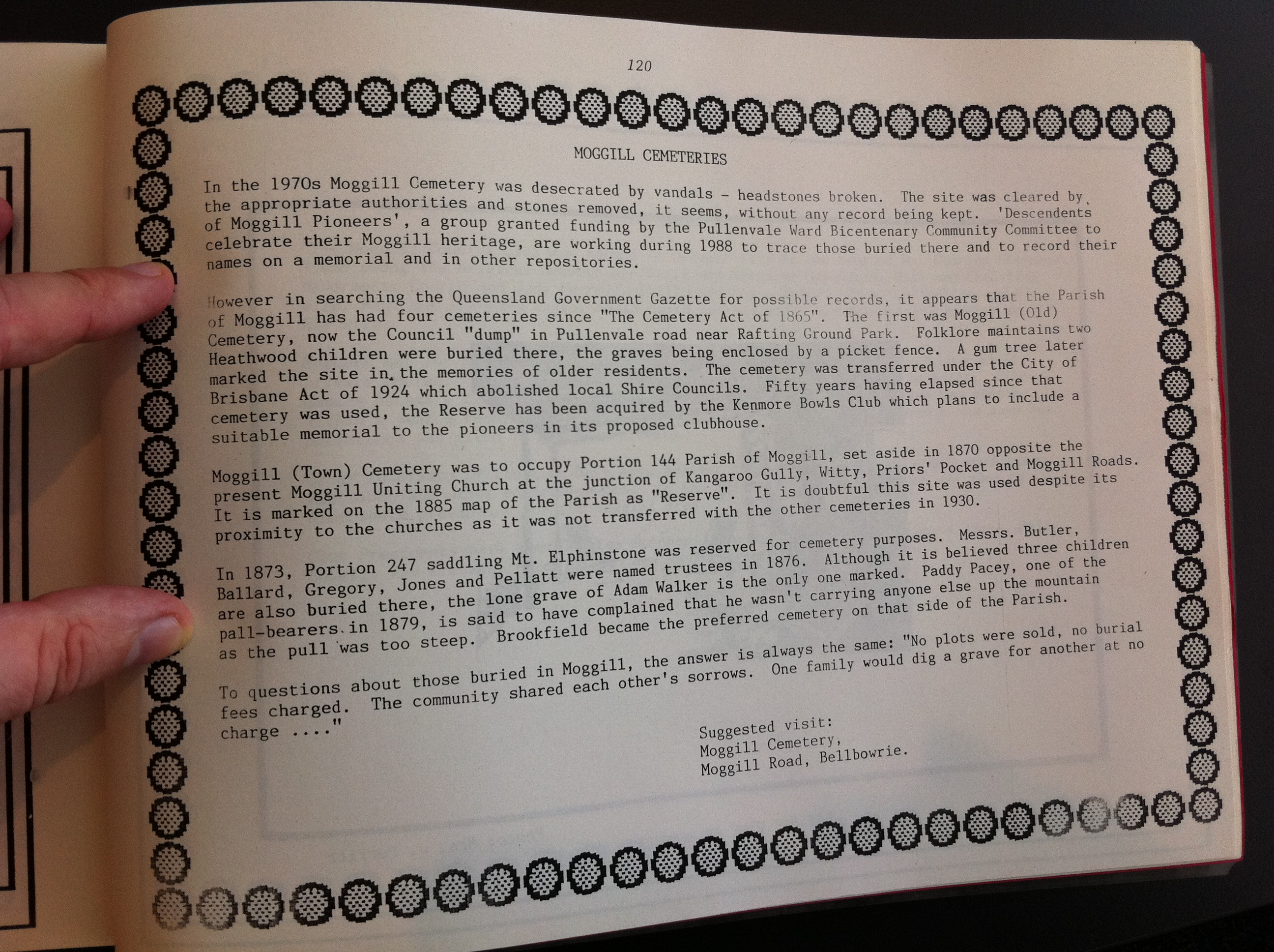celebrate their Moggill heritage, are working during 1988 to trace those buried there and to record their