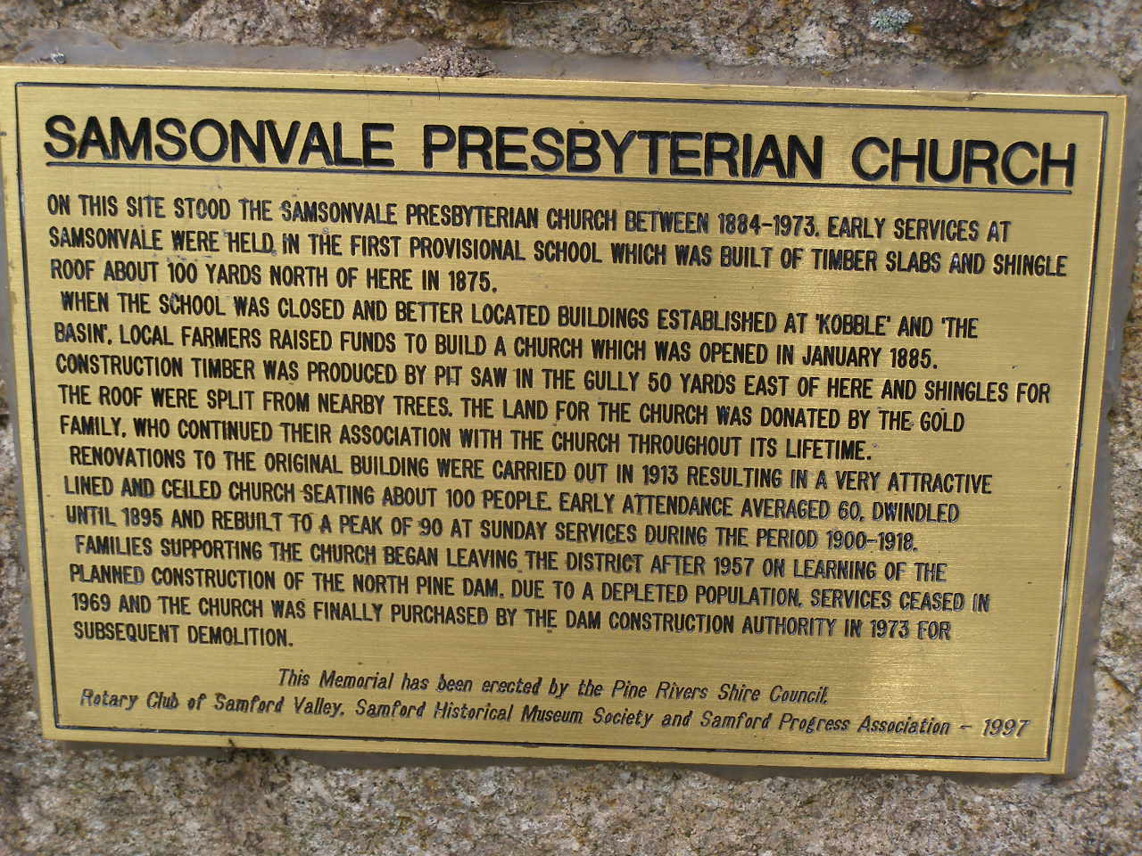 Adjacent to the site of the old Presbyterian Church. The church was built in 1884 on land donated by the GOLD family.It closed in 1969(?) and was eventually demolished in 1973 after acquisition by the water board which controls nearby North Pine Dam.