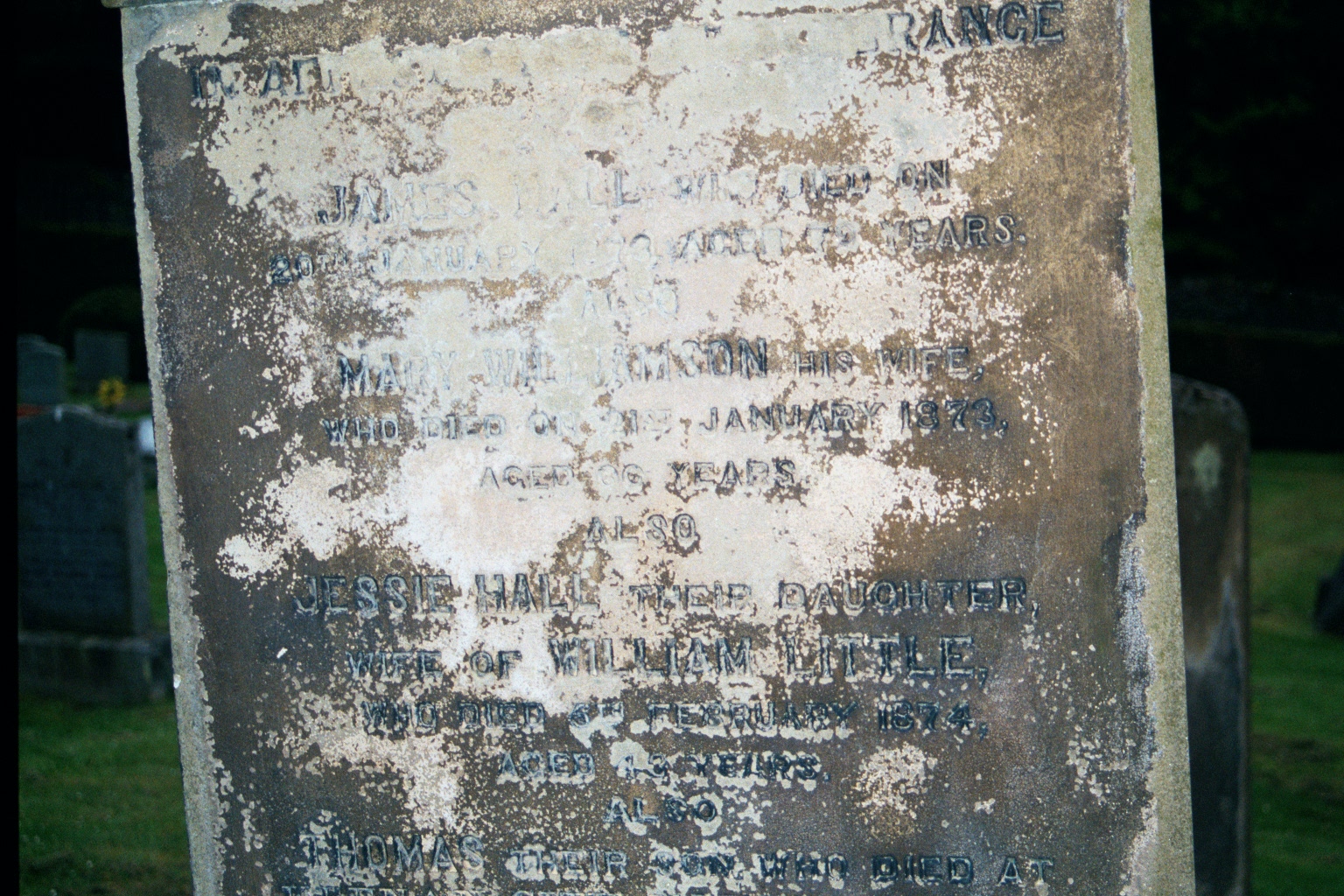 Also Jessie Hall their daughter, wife of William Little who died 5th February 1874 aged 43 years.