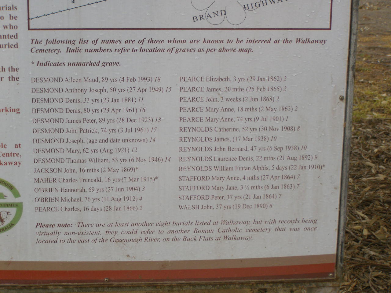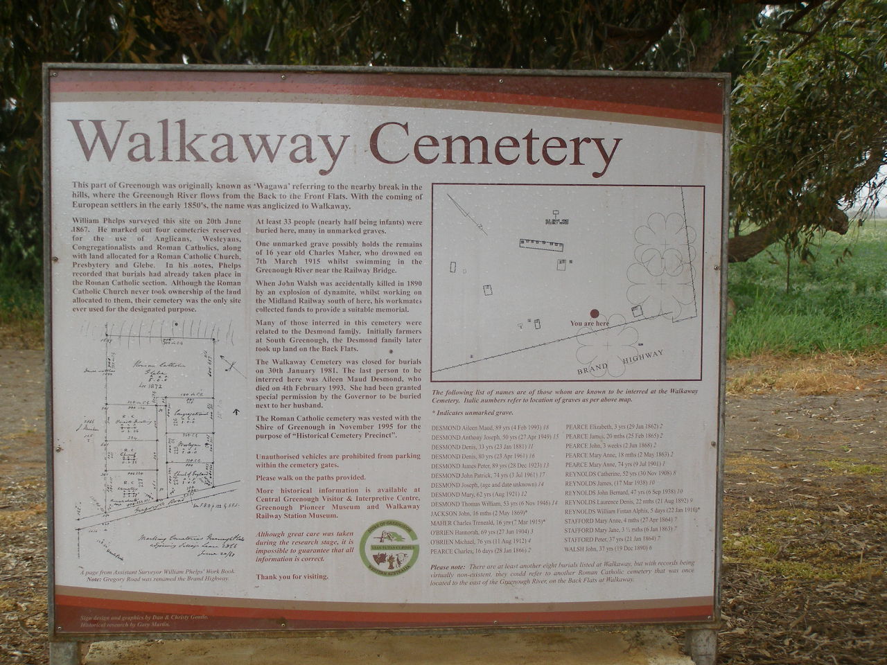 Many of those interred in this cemetery were related to the Desmond family. Initially farmers at South Greenough, the Desmond family later took up land on the Back Flats.