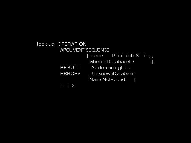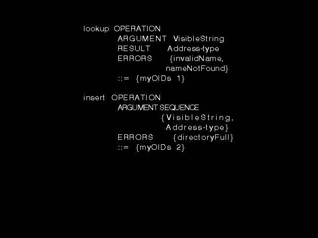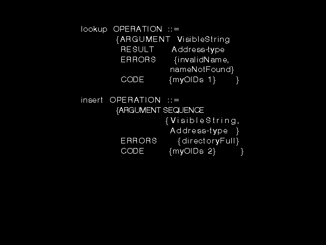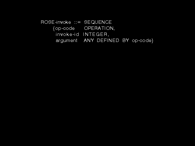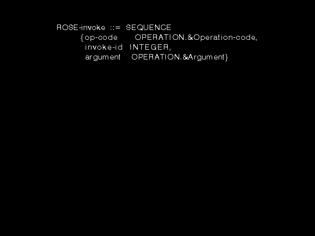 The ROSE group did not define any actual operations. That was for the users of ROSE (the main-stream X.400 workers) to do, but they did want a simple and defined notation specifying that would let such other workers define operations to be invoked using ROSE. The syntax of figure 8.7 was designed to provide precisely that.