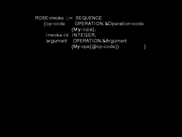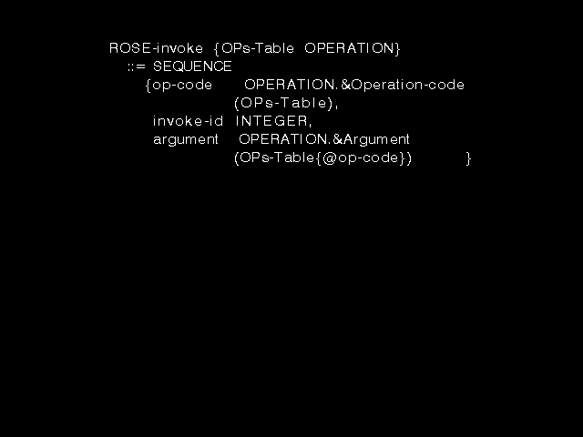 which, surprise, surprise, (with an appropriate definition of the new type syntax and the new value syntax in the OPERATION macro) is just the syntax proposed for addition to ASN.1 in order to support the ROSE requirement for a notation to define operations!