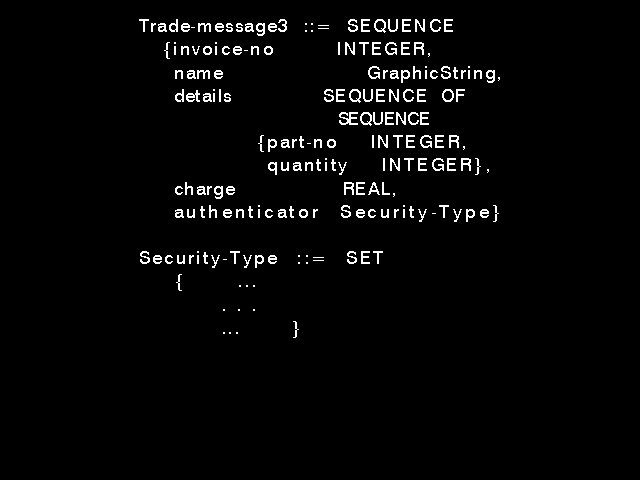 The best way to understand any language or notation is to read a few examples of it, and these are readily obtainable from any of the OSI application layer standards. figure 8.1: An ASN.1 datatype definition and figure 8.2: An ASN.1 datatype definition (bis) are often-quoted examples originally developed by this author. They are fictitious, designed only to illustrate features.