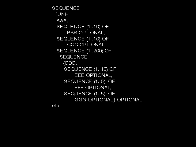The interesting part of EDIFACT for the purposes of this chapter is the notation for defining message structures at the abstract level. This is the graphical syntax of EDIFACT. figure 8.19: Edifact graphical syntax shows an example of a simple datastructure defined using the EDIFACT notation, and figure 8.20: Equivalent ASN.1 shows the equivalent ASN.1 type definition. Some work has been done comparing the power of this notation with ASN.1, and it is clear that a formal mapping could be defined from the EDIFACT graphical syntax to ASN.1 (but not the reverse - ASN.1 is more powerful). Those who are not computer programmers generally find the EDIFACT graphical notation more usable than ASN.1, and it remains the case for the present and perhaps foreseeable future (in the early 1990s) that EDIFACT will remain as an abstract syntax notation and encoding rules for transfer syntax alongside ASN.1. Its use is likely to be (as the name implies) largely restricted to the definition of trade-related documents and perhaps personnel record systems, rather than for general-purpose application layer protocols. It would not be totally unreasonable to equate ASN.1 with Fortran and EDIFACT with COBOL.
