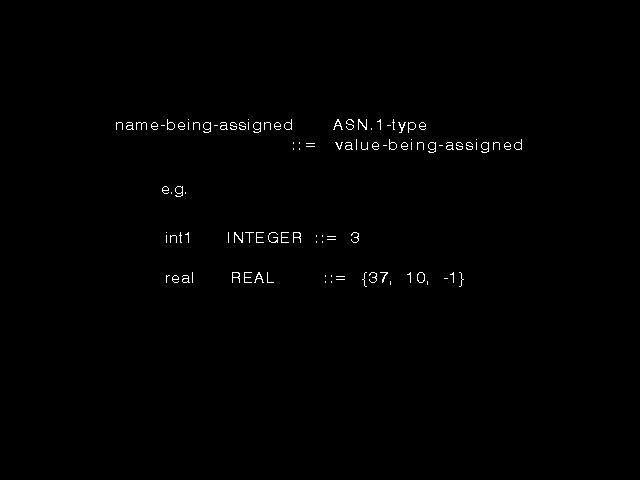 The value notation was originally designed specifically to support the DEFAULT keyword, but it has found applications within the English text of application standards to identify special cases, in tutorials to identify values being transmitted, in the notation for defining subtypes of a type, and latterly in the newly introduced information object concept (see below). In the case of OBJECT IDENTIFIERS, there are many, many more instances of the value notation (to assign object identifier values to modules, abstract syntaxes, transfer syntaxes, and so on) than there are instances of use of the words OBJECT IDENTIFIER for type definition. As with the type notation, the value notation is fairly obvious and easily understood. Further discussion here is not appropriate.