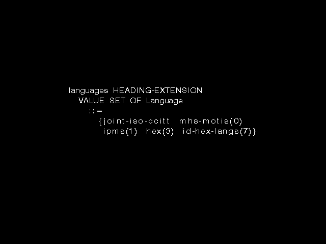 An interesting (?) feature of ASN.1 is its macro notation. In 1982, when an early draft of X.409 was presented to ISO Experts, it looked very similar to what it is now: a notation for defining abstract syntaxes, that is, sets of abstract values, that is a notation for defining data types (plus the encoding rules). In the next version, however, its nature suddenly dramatically changed with the introduction of a major new piece of syntax (with no associated encoding rules) into the language, purporting to allow the definition of "operations". The reason was simple. X.409 was never seen by CCITT workers as simply a language for defining data structures. It was seen as a language providing notational support for the whole of the X.400 work, whatever that might imply. Data structure definition for protocol messages was an important part of that, but was not the whole requirement.